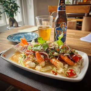Green mussels, king prawns and squid rings stir fried with ‘Top Secret’ garlic & herb mix, onions, peppers and fresh chillies. Finished with basil.